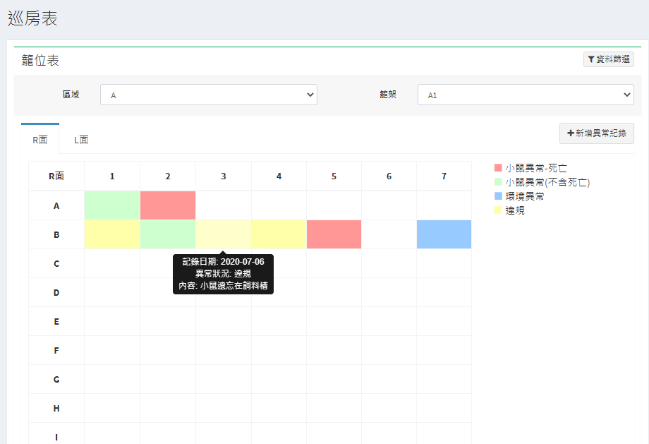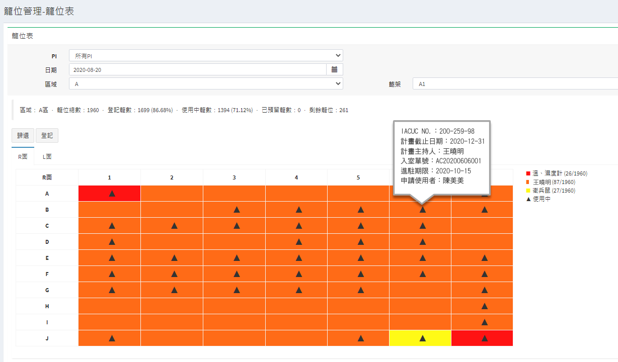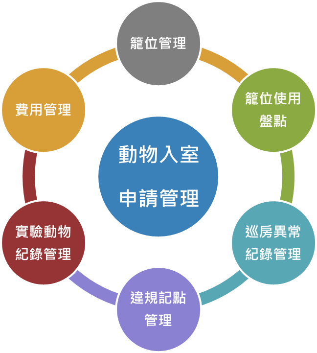 系統功能包含: 動物入室申請管理、籠位管理、籠位使用盤點、巡房異常紀錄管理、違規記點管理、實驗動物紀錄管理、費用管理