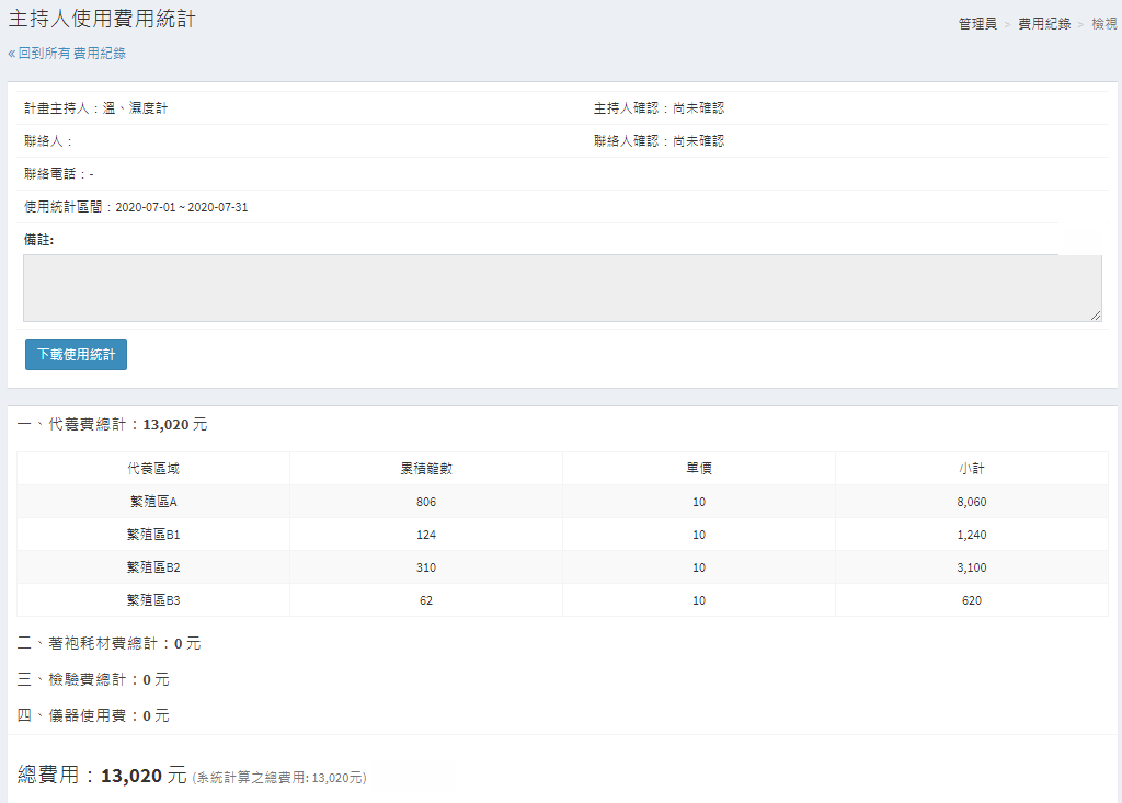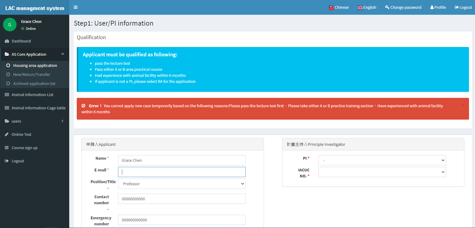 此系統包含了實驗動物中心內部所有的申請業務流程管理,並且可以動物實驗審查系統資料介接。