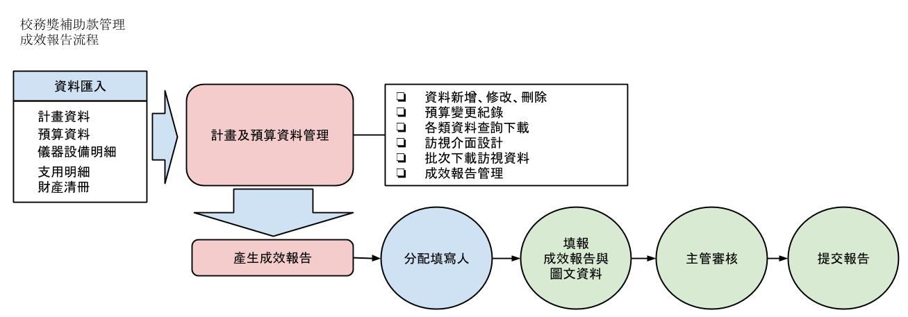 系統功能包含:帳號管理、單位管理、資料匯入功能、資料編輯管理、系統自動編號、管理表單下載、預算變更紀錄、資料查詢、成效報告管理、成效報告流程、成效填報進度管理、委員訪視用介面、訪視資料下載。