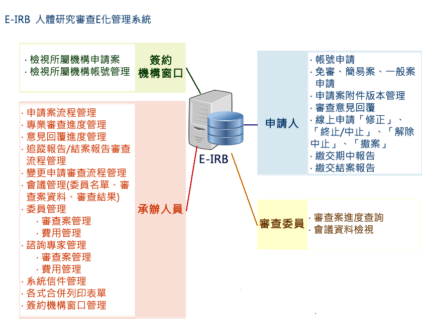 系統功能包含: 各類型申請案電子表單、申請附件版本管理、專業審查進度管理、審查意見回覆進度管理、申請案流程管理、追蹤報告/結案報告審查流程管理、變更申請審查流程管理、會議管理、委員管理-各委員審查案及費用管理、下載審查費清單、線上檢視會議資料、簽約機構窗口管理、帳號管理。