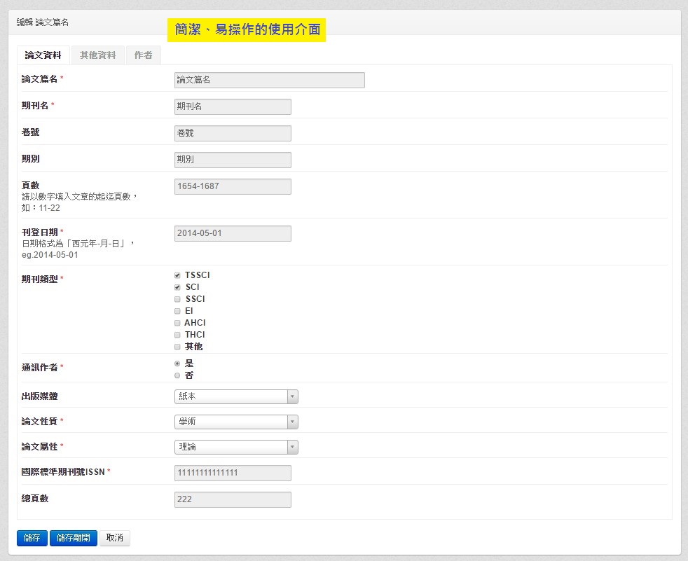 從事學術研究的工作,往往需要花許多時間維護自己的學術成果資料,如果有一個好用的成果管理系統,不僅能節省時間、並提高了成果資料的應用性。 我們設計了一套學術成果系統,不僅提供了各類型資料表記錄各種研究成果和學術活動,並且還為使用者設計了直覺性的使用介面,最棒的是,可以介接其他資料庫,使用者在自己的機構不需要重覆填寫相同資料,省去了時間的浪費、和避免資料填寫錯誤的問題。