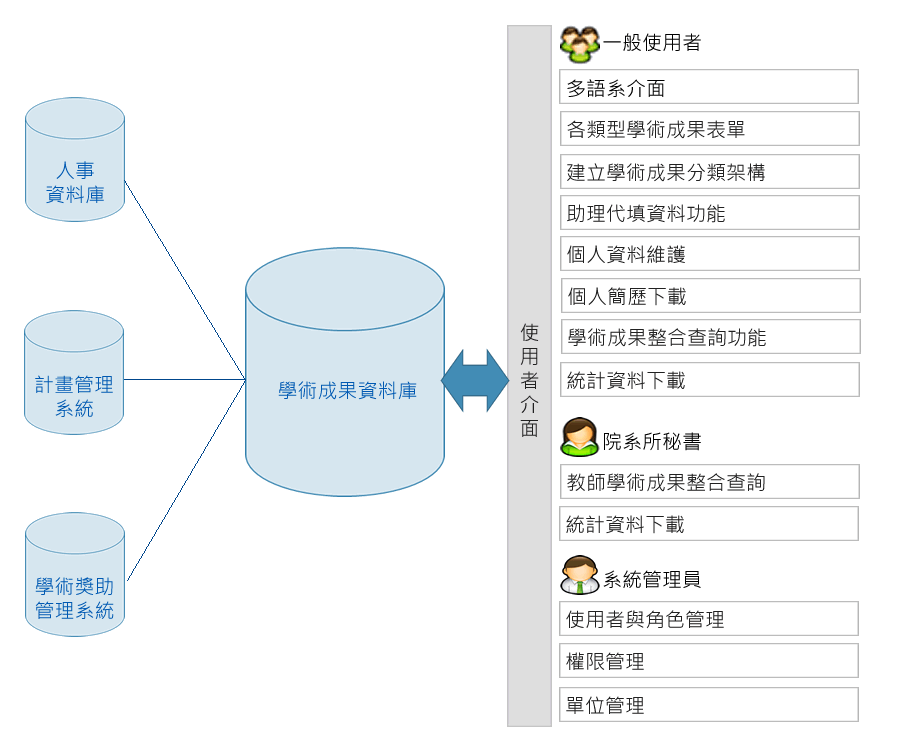 學術成果系統的功能包含:多語介面切換、學術成果填寫、助理代填功能、整合查詢功能、統計報表、帳號管理、界接其他系統資料。